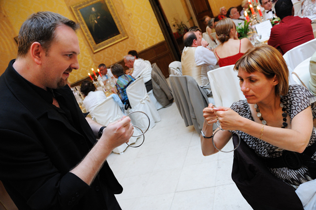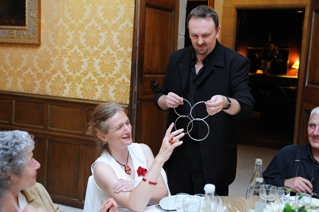 J’anime  avec de la magie close-up soirées et repas d'entreprises depuis plus de 15 ans.  Je passe de groupe en groupe et je diverti les invités avec des tours en close-up, c'est à dire à quelques centimètres des convives. J'utilise toutes sortes d'accessoires, des cartes bien sûr mais également des élastiques, des balles, des bagues etc...
